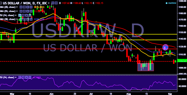 We prefer to go short on USD/KRW only below 1,102 with stop loss at 1,122 and target of 1,092/1,078.