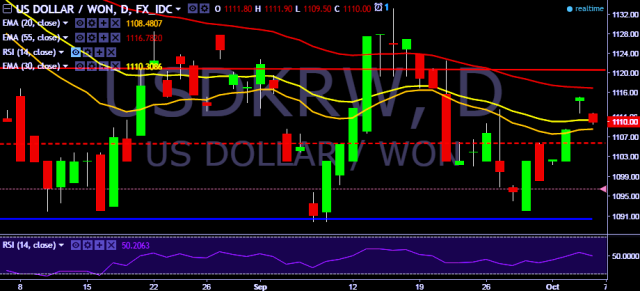 We prefer to go short on USD/KRW only below 1,107 with stop loss at 1,117 and target of 1,101/1,092.