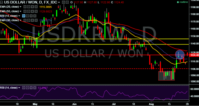 We prefer to take short position in USD/KRW around 1,126 with stop loss at 1,132 and target of 1,107.