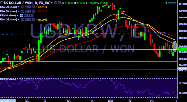 We prefer to take short position in USD/KRW aroiund 1,146, stop loss 1,153 and target of 1,132/1,127.
