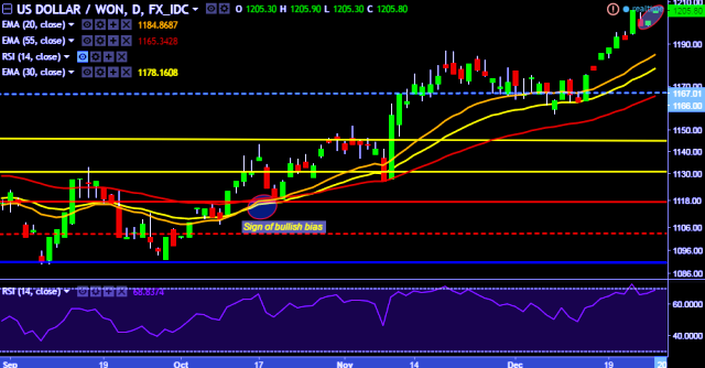 - USD/KRW is currently trading around 1,205 levels.