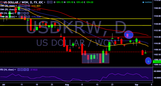 We prefer to go short on USD/KRW only below 1,092 with stop loss at 1,117 and target of 1,078/1,063.