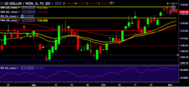 We prefer to go short on USD/KRW only below 1,142, stop loss 1,152 and target 1,127.