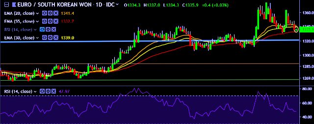 - EUR/KRW is currently trading around 1,336 mark.