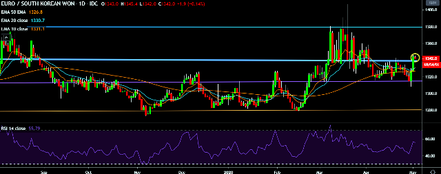 - EUR/KRW is currently trading around 1,342 mark.