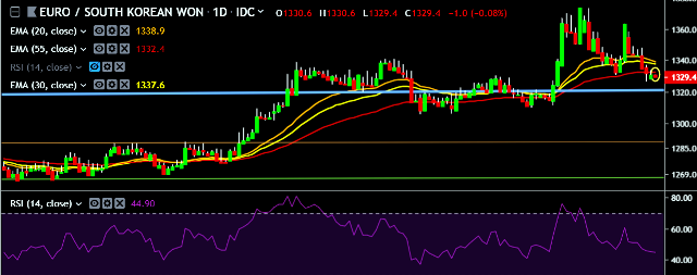 We prefer to take short position on EUR/KRW only below 1,328, stop loss 1,340 and target of 1,311.