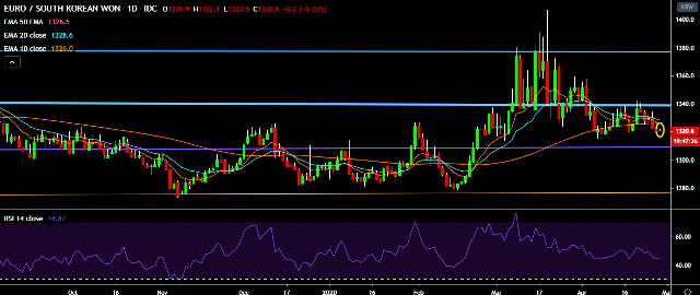 - EUR/KRW is currently trading around 1,321 mark.