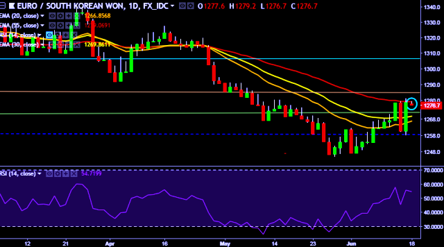 We prefer to take long position on EUR/KRW only above 1,280, stop loss at 1,267 and target of 1,294/1,302.