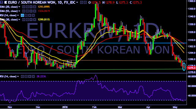 We prefer to take short position on EUR/KRW around 1,276, stop loss at 1,290 and target of 1,264/1,252.
