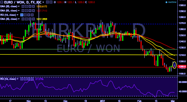 We prefer to take short position in EUR/KRW only below 1,199, stop loss at 1,208 and target of 1,184.