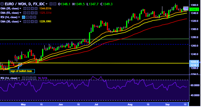 We prefer to take long position on EUR/KRW only above 1,352, stop loss at 1,343 and target of 1,363.