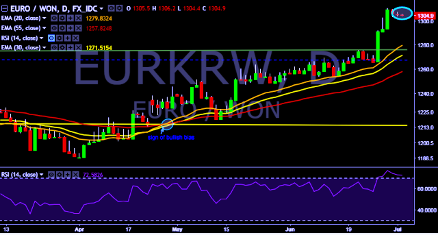 We prefer to take long position in EUR/KRW only above 1,310, stop loss at 1,292 and target of 1,338.