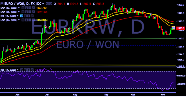 We prefer to take long position on EUR/KRW only above 1,305, stop loss at 1,298 and target of 1,313/1,327.