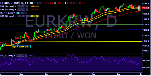 We prefer to take long position on EUR/KRW only above 1,344, stop loss at 1,337 and target of 1,355.