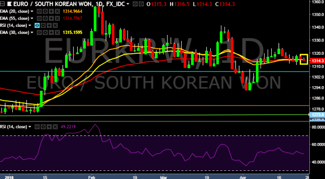 We prefer to take long position on EUR/KRW only above 1,318, stop loss at 1,310 and target of 1,332.
