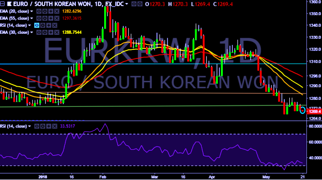We prefer to take short position on EUR/KRW around 1,270, stop loss at 1,280 and target of 1,242.