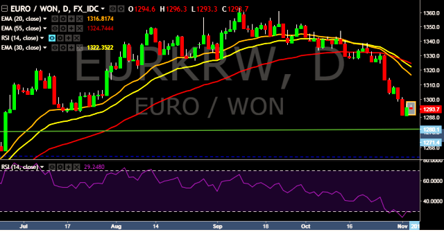 We prefer to take short position on EUR/KRW only below 1,288, stop loss at 1,301 and target of 1,253.