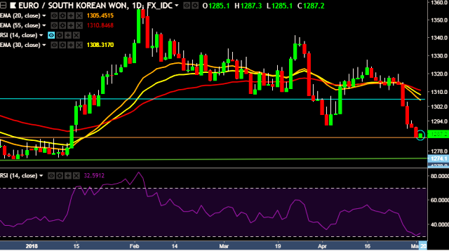 - EUR/KRW is currently trading around 1,287 mark.