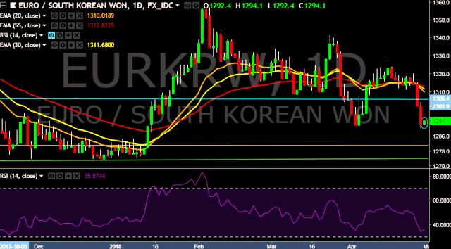 We prefer to take short position on EUR/KRW around 1,296, stop loss at 1,302 and target of 1,289/1,273.