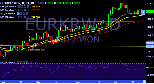 We prefer to take long position in EUR/KRW only above 1,305, stop loss at 1,290 and target of 1,321/1,338.