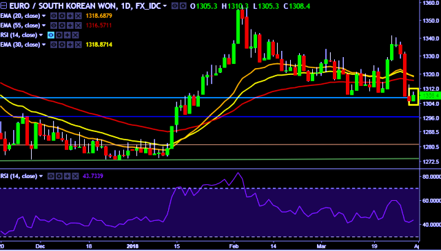 We prefer to take short position on EUR/KRW only below 1,305, stop loss at 1,315 and target of 1,273.