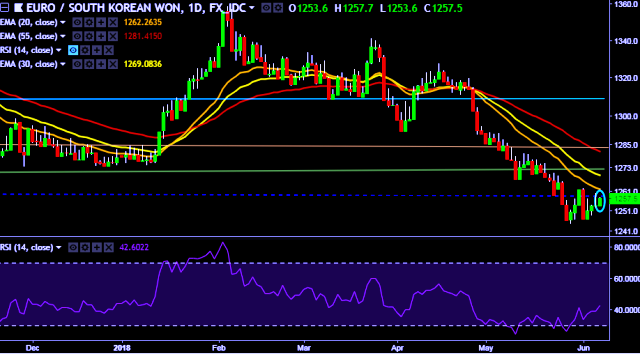 We prefer to take long position on EUR/KRW only above 1,262, stop loss at 1,246 and target of 1,280.