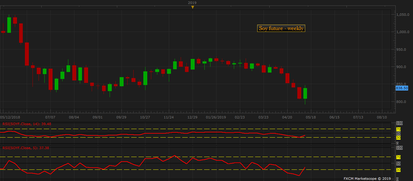 As a result of the trade war between the U.S. and China, the Soybean price declined 790 cents per bushel. However, President Trump successfully placed a floor under it. The price is currently trading at 838 cents per bushel.