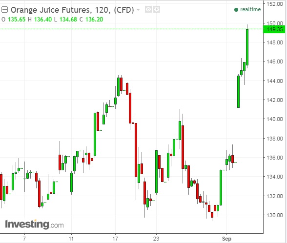 The price of orange Juice concentrates spiking higher as Irma approaches. This chart from Investing.com shows, the On Friday last week, the price was at $135 for a 15,000-pound contract for November delivery but on Tuesday (Monday U.S. market was closed) the price was at $145 and today it has reached $149.5. Before the storm formed, Florida was expected to produce more than half of the U.S. oranges and nearly half of the country's grapefruit, according to the U.S. Department of Agriculture's forecasts in July. Florida is the world's second-largest orange juice producer, after Brazil.