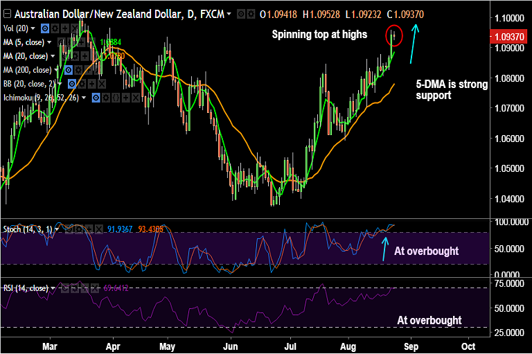 - AUD/NZD is trading largely unchanged on the day, after hitting 5-month highs at 1.0958 on Wednesday's trade.