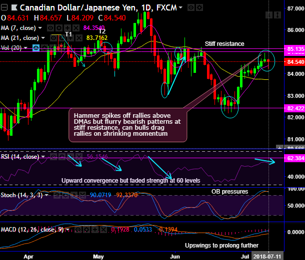 On daily plotting of CADJPY, hammer candlestick patterns at 82.529 and 82.678 levels have taken off rallies above 7 and 21 DMAs, but spinning top, shooting star and hanging man candlesticks which are bearish patterns have popped at stiff resistance to counter-rallies.