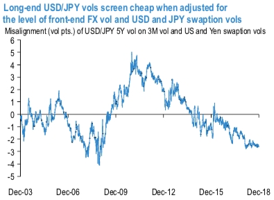 While subdued yen vol levels are moderately cheap, particularly at the long-end, when adjusted for the level of short-dated (3M) FX vol and USD and JPY interest rate volatilities (refer above chart) such that entry levels into strategic vega longs are reasonably attractive. It is true that JPMorgan’s forecast of 118 on USDJPY spot by mid-2019 – 4% above the current market is not conducive to higher yen vol when viewed through the traditionally inverse spot-vol correlation lens. Yet this disregards the change that has taken place in the Greek profiles of yen option books over the past few years due to corporate structures.