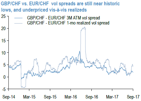 In this situation, if one had to pick one Eurobloc currency to buy vol in, our preferred pick would be GBP, especially on the crosses. We continue to believe that the abrupt shift in BoE policy and the attendant possibility of a policy mistake make sterling a fundamentally more uncertain currency than many others.