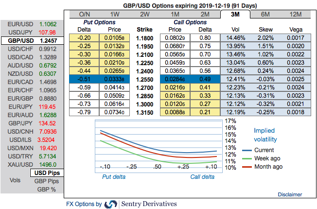 Stay short sterling via a limited loss tail hedge: Stay short a 2M/1M GBPUSD bear put spread (1.2592/1.1958). Courtesy: Sentrix, Saxo & Lloyds