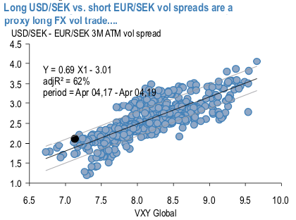 Owning USD vol over cross-vol has almost always acted as a proxy bullish vol stance owning to the greater risk beta of the USD leg, and USDSEK vs EURSEK is no exception (refer 1stchart). Case in point, the 2 vol trough-to-peak vol spike in the VXY index during the EM sell-off of Q2-Q3 last year was accompanied by a near-identical move in the USDSEK – EURSEK 3M vol switch. By construction, the spread is more or less immune to idiosyncratic SEK dynamics (if anything, a tad positively geared to krona noise owing once again to USDSEK’s greater beta).