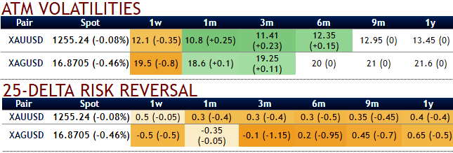 The implied volatilities of XAUUSD (gold) ATM contracts are spiking shy 10.5% and 11.41% of 1m and 3m tenors respectively, while above 18.5% and 19.25% for XAGUSD (silver) ATM contracts of 1m and 3m tenors respectively, while the spot price in technical trend approaching near crucial juncture, falling below 7 & 21 DMAs with bearish crossover (refer above technical chart), but it seems the major trend has been in consolidation phase we foresee equal opportunity for both bulls and bears with option writers of deep OTM calls are on slight upper hand.