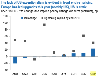 Aside from the broader risk backdrop, monetary policy developments have been modestly negative for AUDJPY insofar as AUD rate expectations have been under more negative pressure this year than any other G10 country (refer above chart).