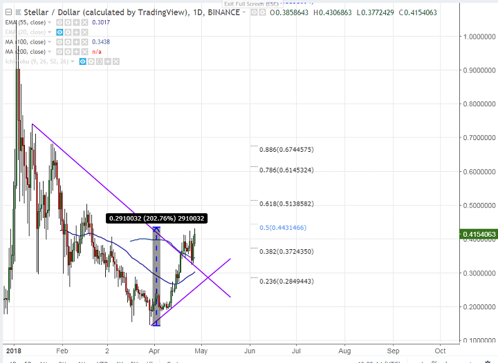 - XLMUSD has recovered massively almost more than from the low of 0.144 made on Mar 29th 2018. The pair hits high 0.43065 and is currently trading around 0.41500.