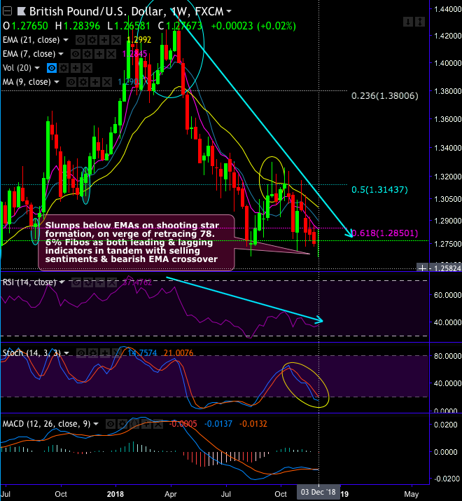 Although you are seeing risk reversals show fresh positive bids, the positively skewed GBPUSD implied volatilities of 3m tenors still signal bearish hedging sentiments. To substantiate this downside risk sentiment, risk reversals have also been in negative territory despite some minor positive bids in the short-run. We see less volatile swings in GBPUSD, if you plot weekly technical chart.