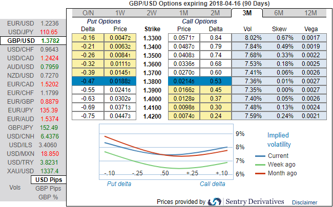 Let’s glance at sensitivity tool, the positive shift in risks reversals in shorter tenors indicates the momentary bullish risks in underlying spot FX prices, while long-term bearish hedging sentiments remain intact. This is justifiable as we've had the considerable bearish major trend since July 2014 prior to the prevailing consolidation phase.
