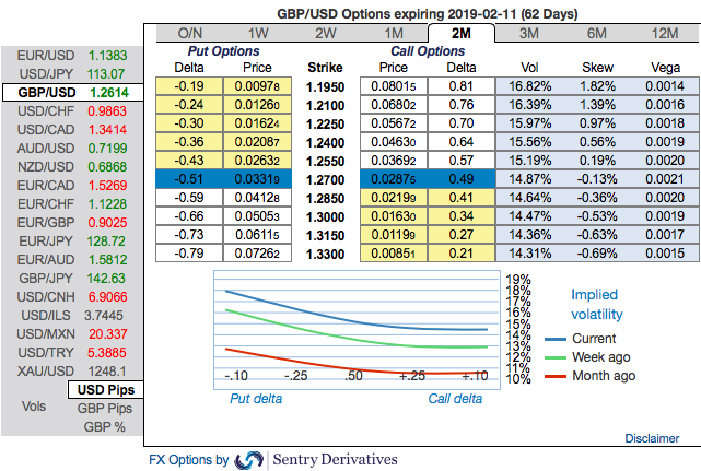 Although you are seeing risk reversals showing fresh positive bids to the existing bearish setup, while the positively skewed GBPUSD implied volatilities of 2m tenors still signal bearish hedging sentiments. To substantiate this downside risk sentiment, risk reversals have also been in negative territory adding minor negative bids in the short-run. We see less volatile swings in GBPUSD, if you plot weekly technical chart.