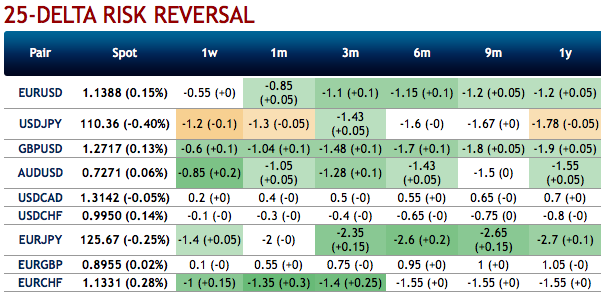 While the risk of a “No Deal Brexit” appears to be slightly waned again from the market’s standpoint, at least that is what the option markets are suggesting at this juncture as minor positive shifts in risks reversal (RRs) numbers are observed for the mild bullish risks, where the prices for hedges against a collapse of Sterling have eased again (refer above nutshell evidencing RRs, you could figure out slight shift in hedging sentiment across all tenors).