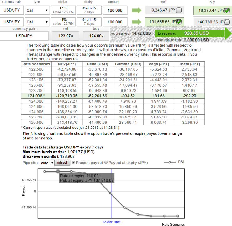 Add longs of 7D (1%) Out-Of-The-Money USD/JPY call and short (-1%) In-The-Money call with the same maturity for a net credit as shown in the diagram.