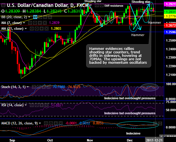 While both the hammer and shooting star patterns are evidencing bullish and bearish effects, the trend seems to be perplexed, in such a puzzling circumstance, both leading as well as lagging oscillators (RSI, Stochastic and MACD), have absolutely been indecisive. As you could see all these indicators are drifting non-directional mode.