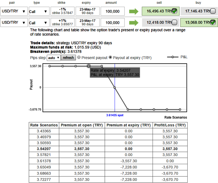 Execution: Keeping the above fundamental factors in mind, it is advisable to go long in 3M (strike at 3.5640) OTM 0.36 delta call while writing 1m ITM call (strike at 3.5640) with positive theta and delta closer to zero (both sides use European style options), this credit call spread option trading strategy is recommended when USDTRY spot FX price is anticipated to drop moderately in the near term and spikes up in long term.