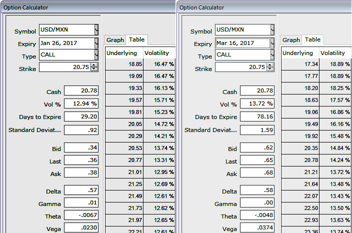 1m ATM IVs are trading a tad below 13% and trending above 13.7% for 3m tenors. So if you intend to hedge the bullish or bearish risks of USDMXN exposures via FX options, one should be mindfull of moneyness of these instruments.