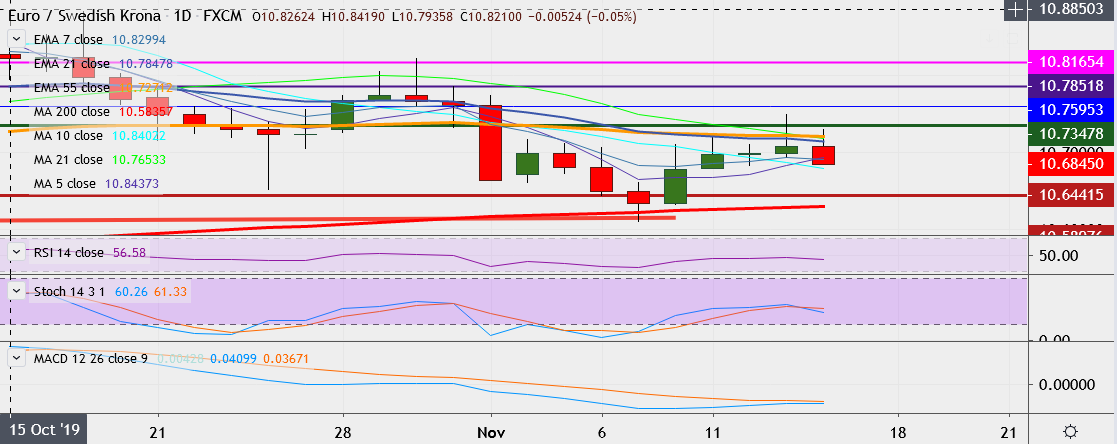 - EUR/SEK trades 0.1 percent down at 10.6923, having hit a high of 10.7488 the day before, its highest since November 1.