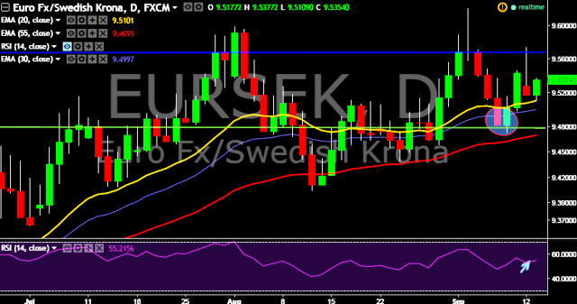 We prefer to go short on EUR/SEK around 9.54, stop loss at 9.5744 and target of 9.5109.