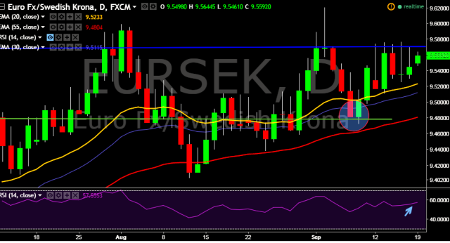 We prefer to go short on EUR/SEK around 9.56, stop loss at 9.5713 and target of 9.5256/9.5109.