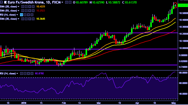 We prefer to take long position in EUR/SEK around 10.6150, stop loss 10.5558 and target 10.6858.