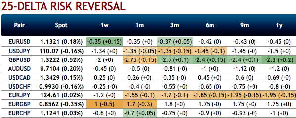 25-delta risk reversals indicate the difference in volatility, and therefore price, between puts and calls on the most liquid out-of-the-money (OTM) options quoted on the OTC market. Negative bids indicate puts are more expensive than calls (downside protection is relatively more expensive).